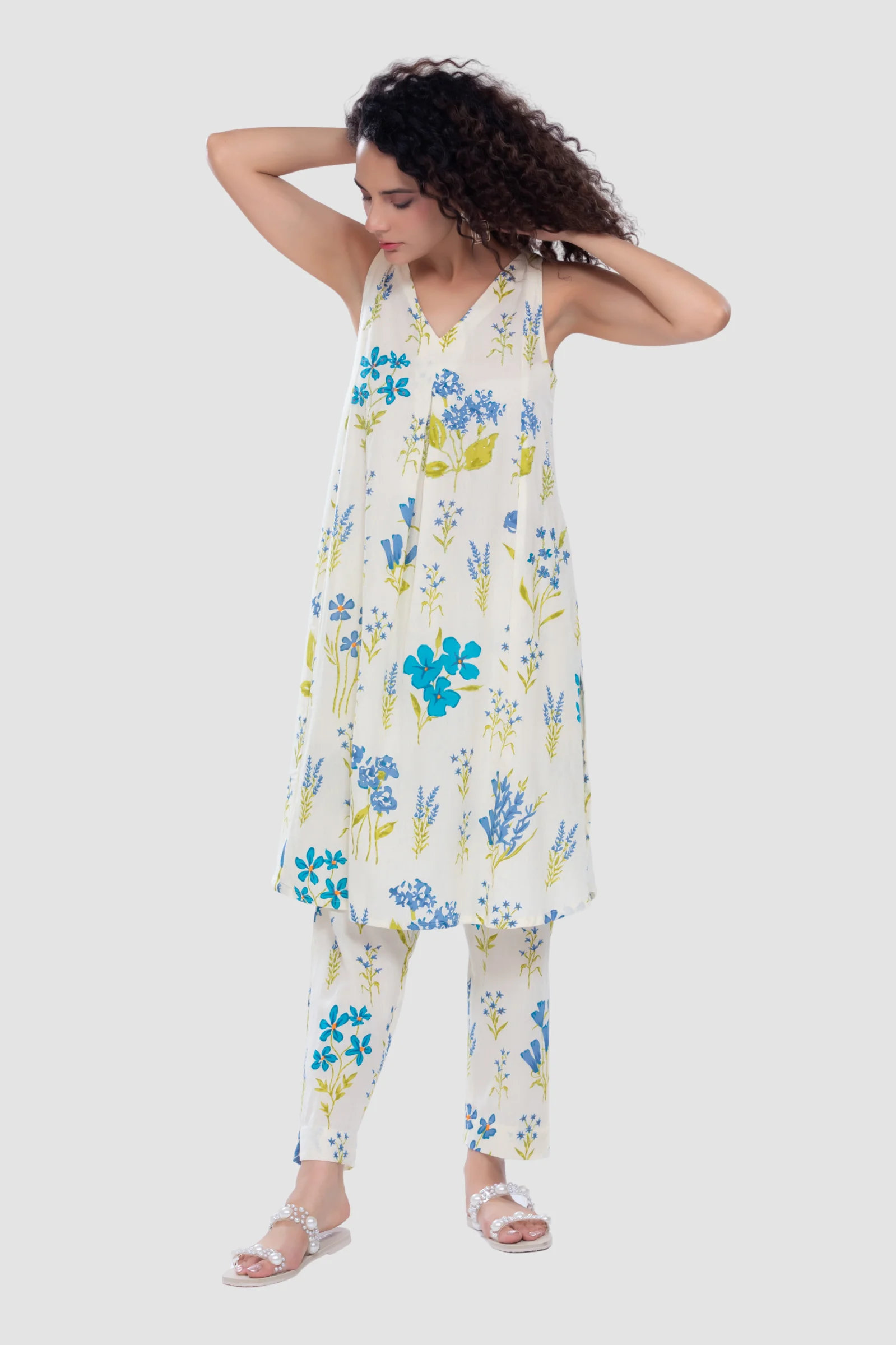Step out in effortless style with this long co-ord set, crafted from pure flex cotton and hand screen-printed with delicate floral motifs. The kurta features a slender V-neckline with a chic front pleat, creating a graceful and flowy silhouette that enhances your feminine charm. Intricate hand aari highlights accentuate the prints, adding a refined handcrafted touch.