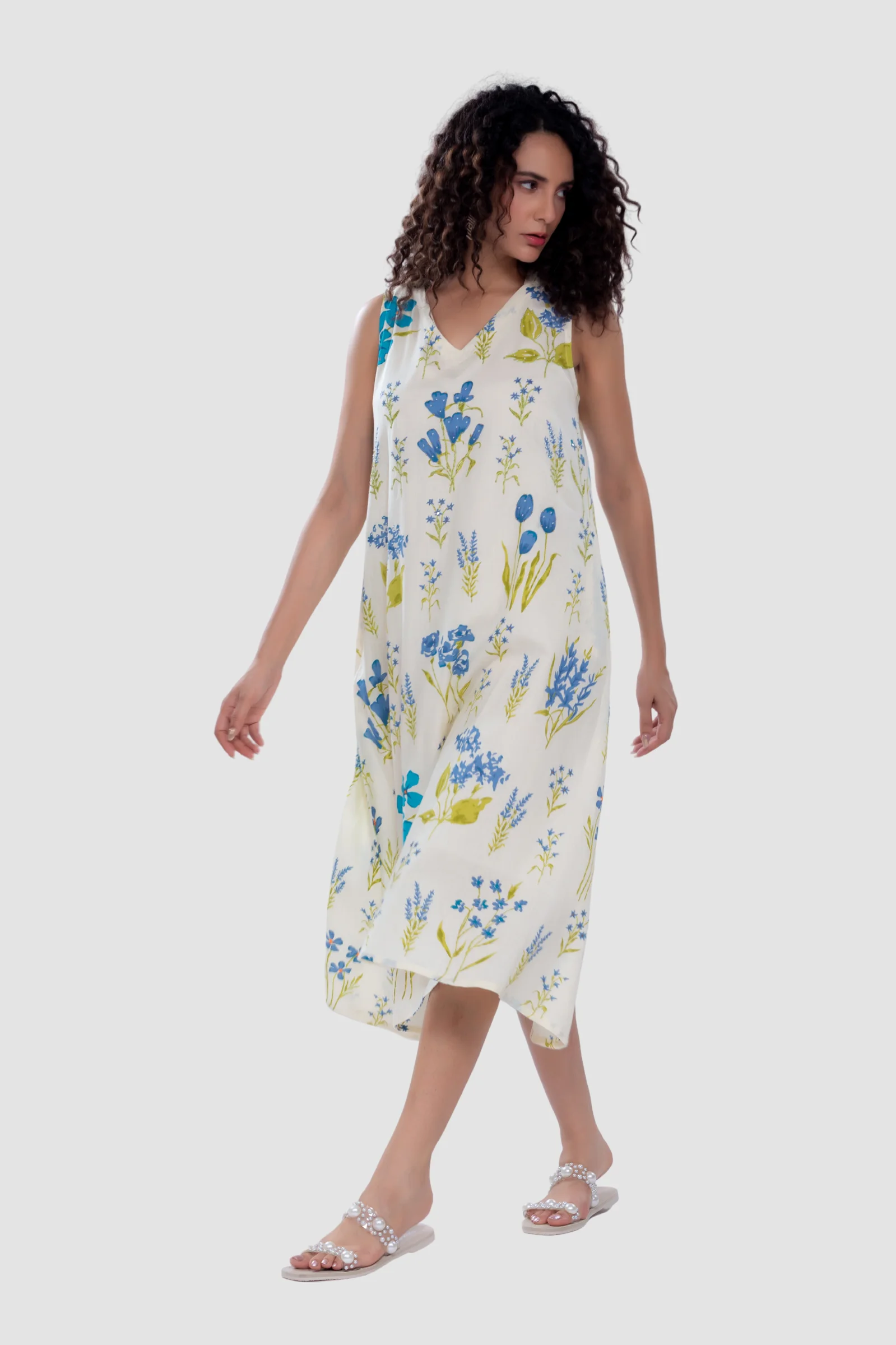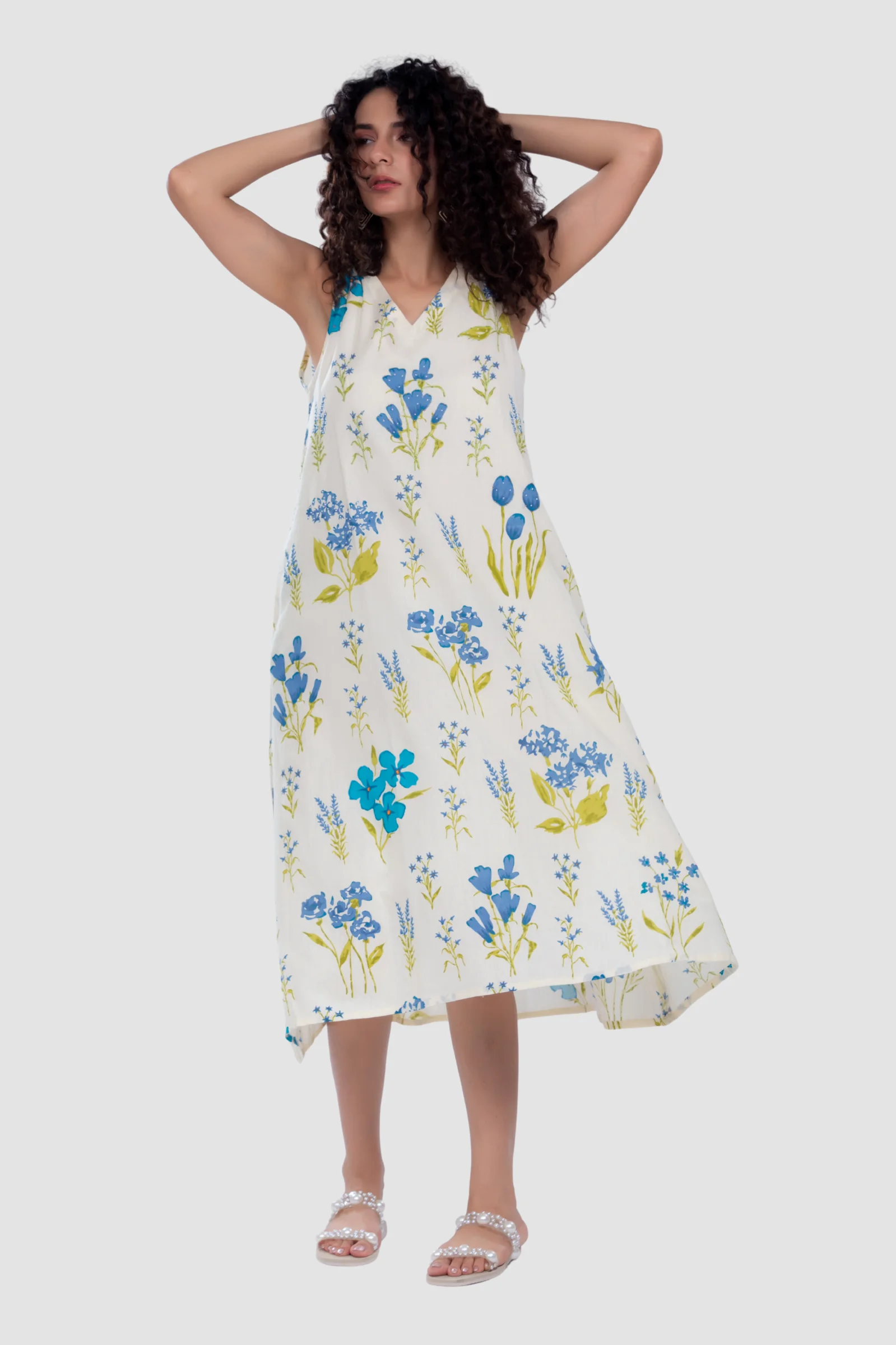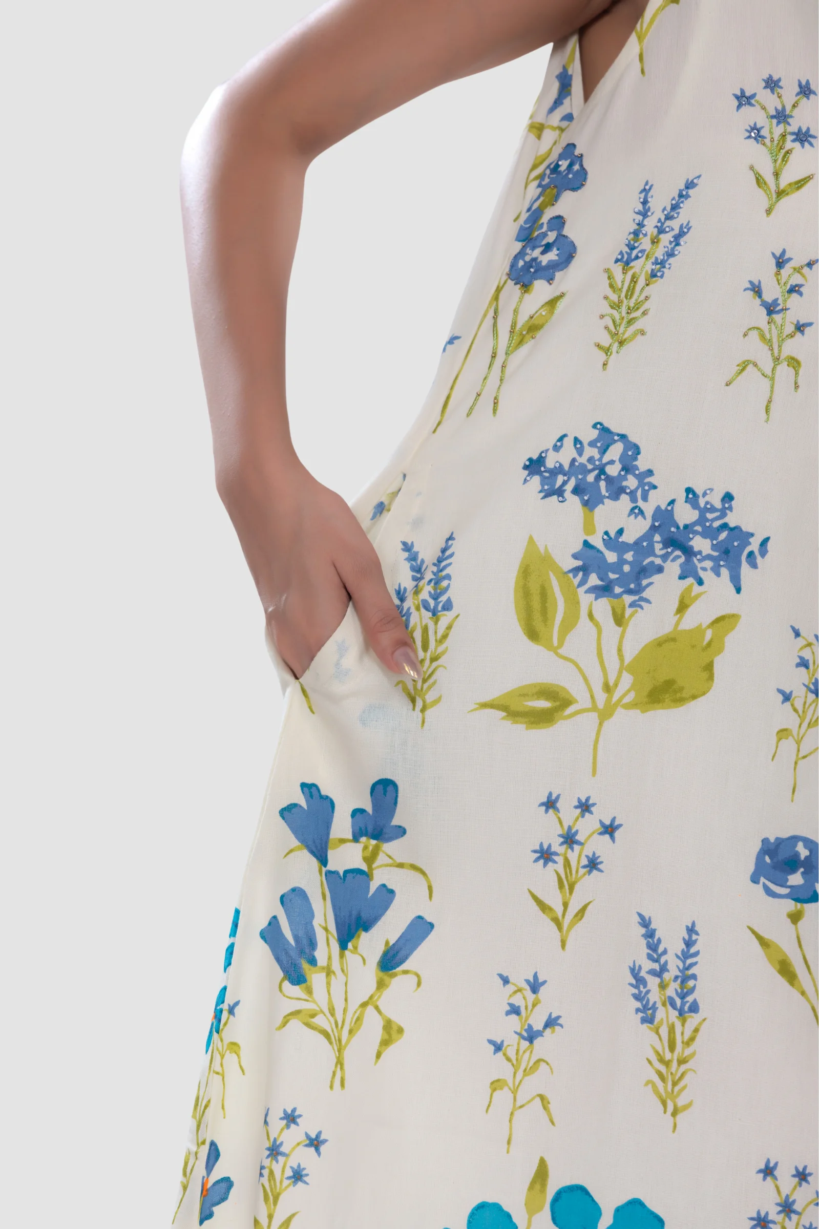 The V-neckline adds a touch of sophistication, while delicate hand Aari work highlights the intricate floral motifs, giving it an artisanal finish. Perfect for brunches, casual outings, or relaxed evenings, this flared tunic pairs beautifully with leggings, trousers, or can be worn solo as a breezy dress.