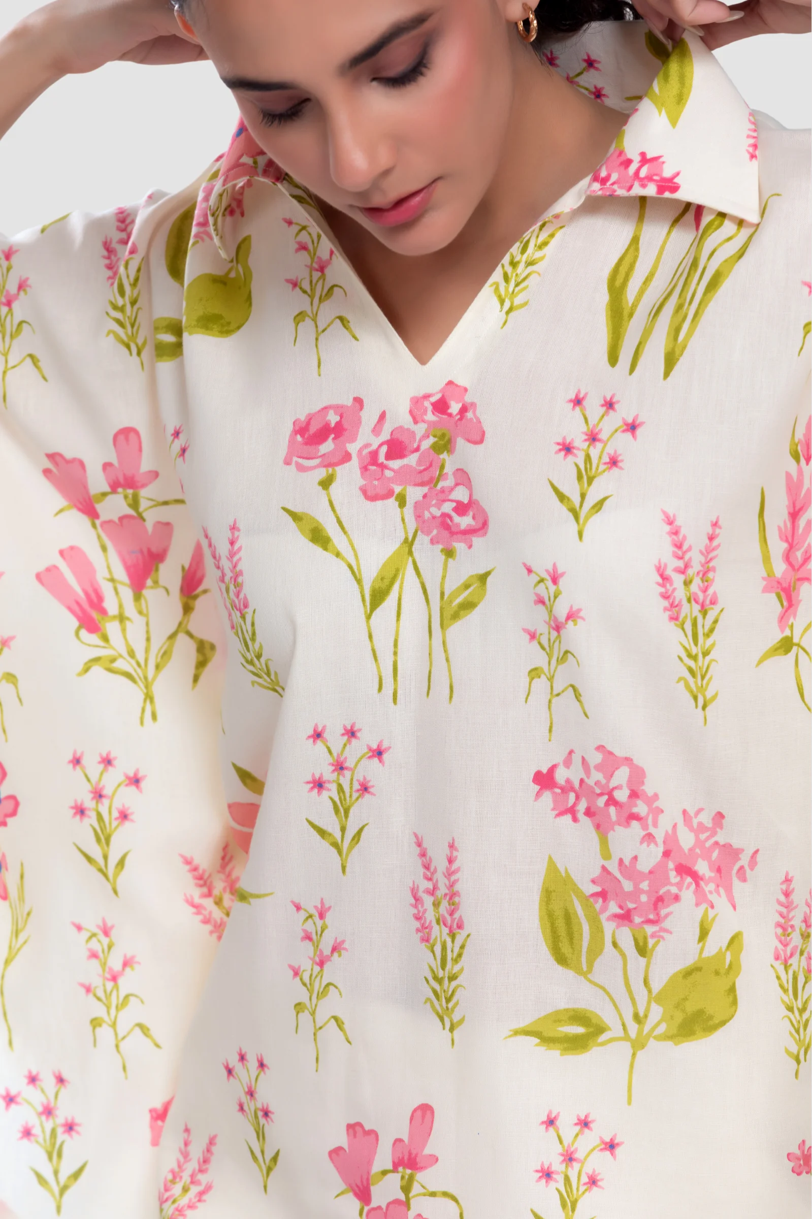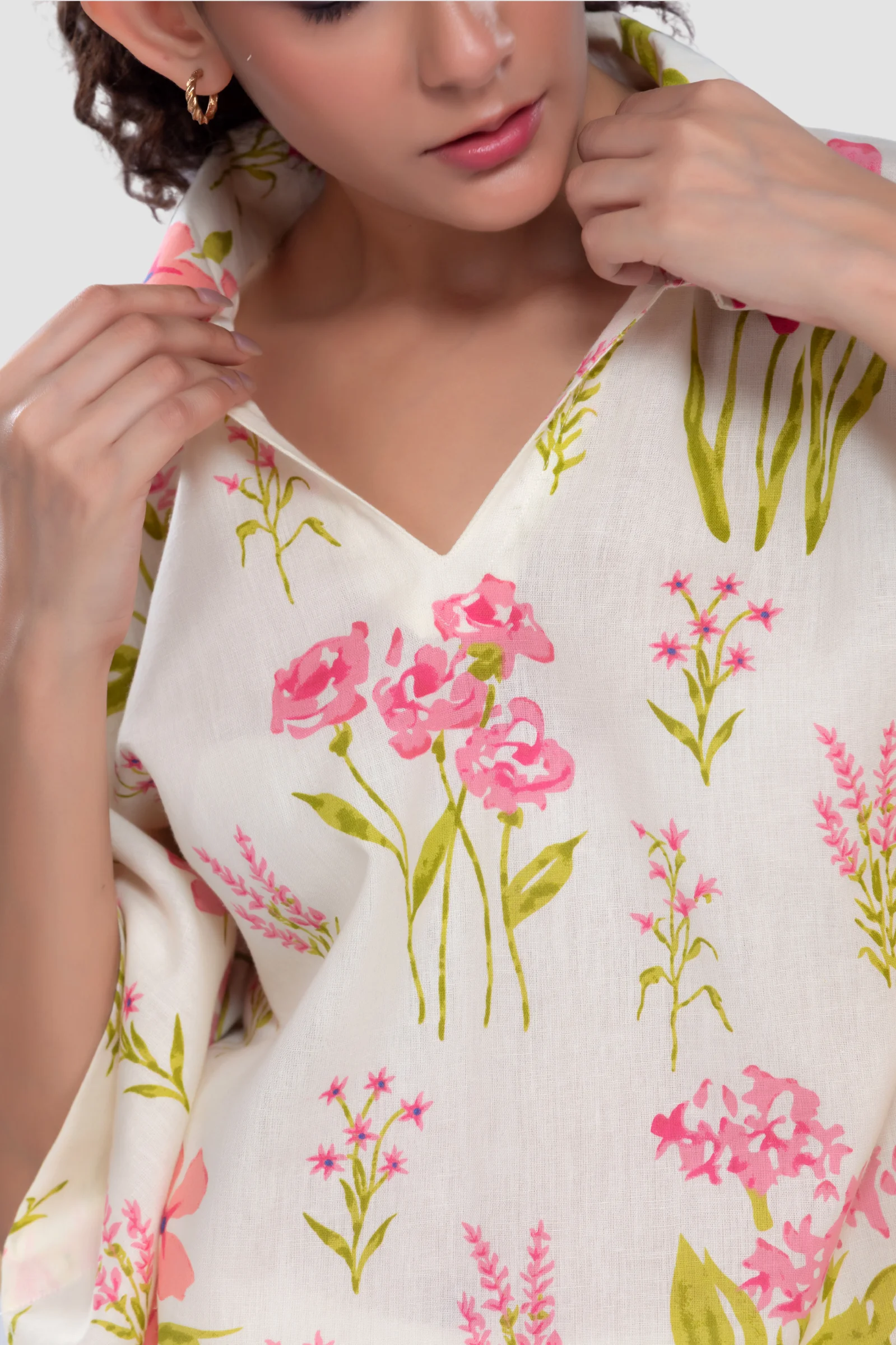 Let your days flow as gracefully as a meadow breeze with our Pink Cerise Kaftan Top. Crafted from hand screen-printed Flex Cotton, this collared V-neck top celebrates freedom, movement, and effortless elegance. The soothing blue florals on a cream canvas evoke calm — making it perfect for daily wear, work-from-home hours, or sunny college days. Its rounded hemline and free-flowing kaftan silhouette drape beautifully on every body type, promising both comfort and style in one gentle embrace.
