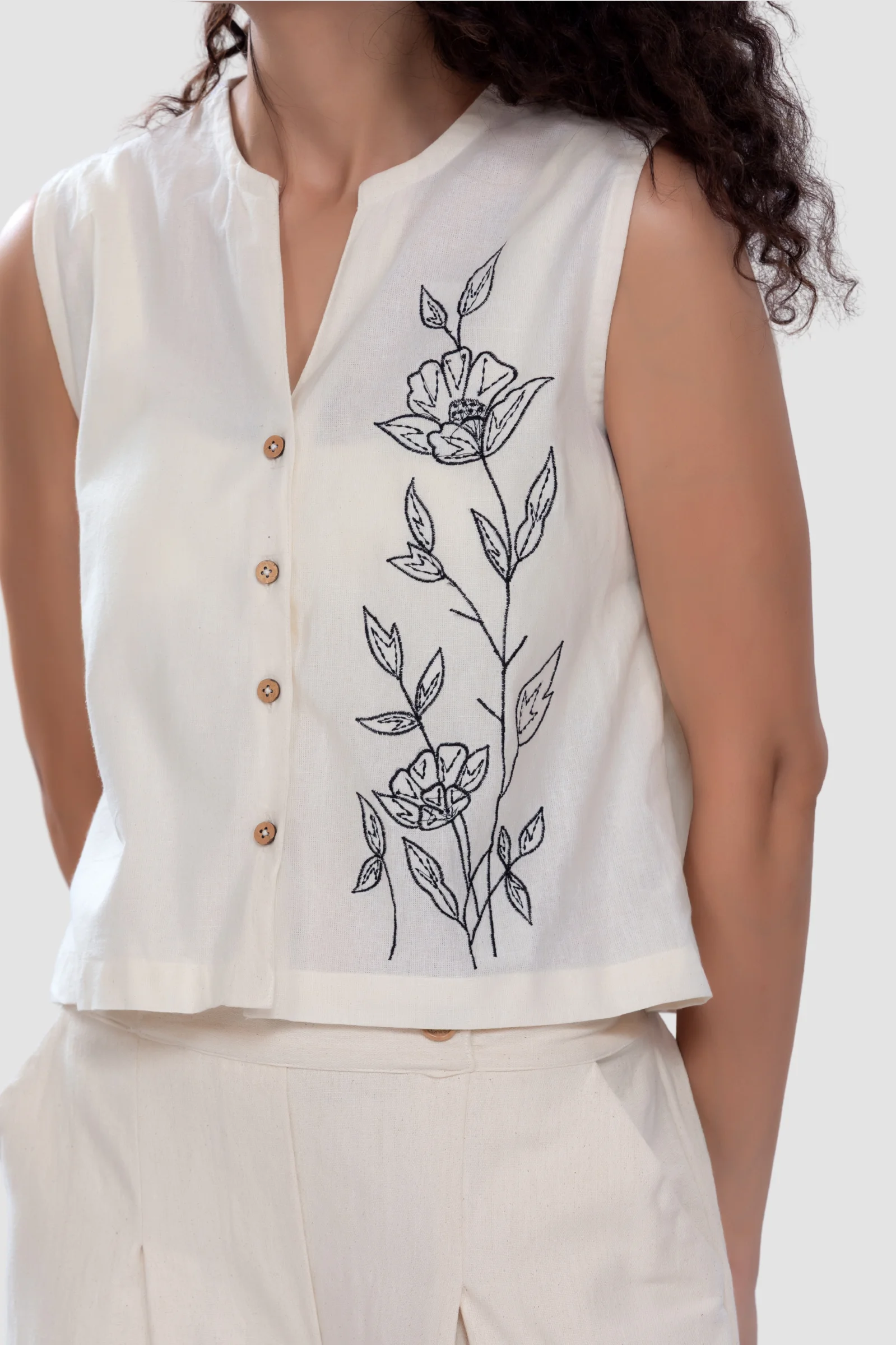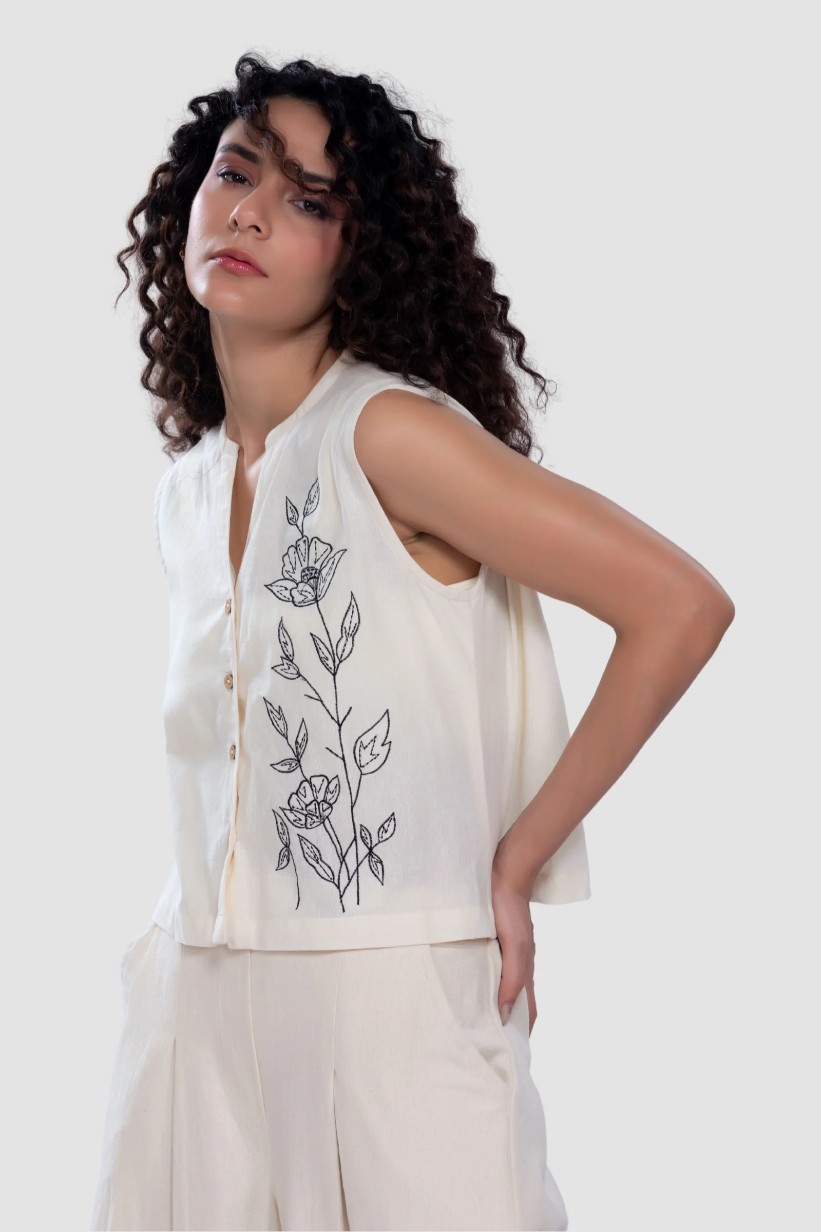 A pure cotton sleeveless crop top in soft ivory, featuring delicate black floral embroidery, wooden buttons, and a relaxed fit — minimal, breathable, and effortlessly chic.