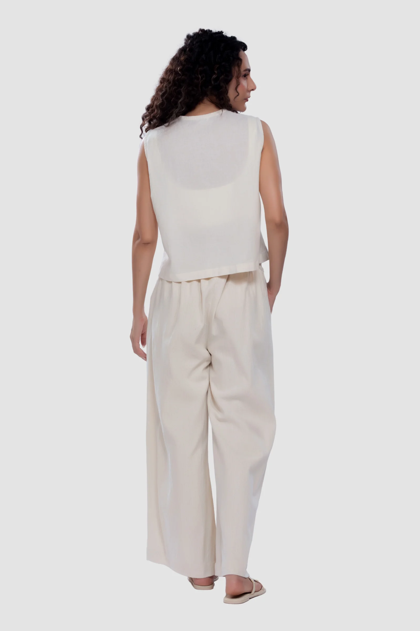Elevate your everyday style with this ivory sleeveless top, crafted from 100% pure cotton for a soft, breathable feel. Designed with a relaxed cropped silhouette, it features a V-neckline, wooden button detailing, and delicate floral embroidery in contrasting black thread. The minimal design and neutral tone make it a versatile wardrobe essential that pairs effortlessly with trousers, skirts, or denims.