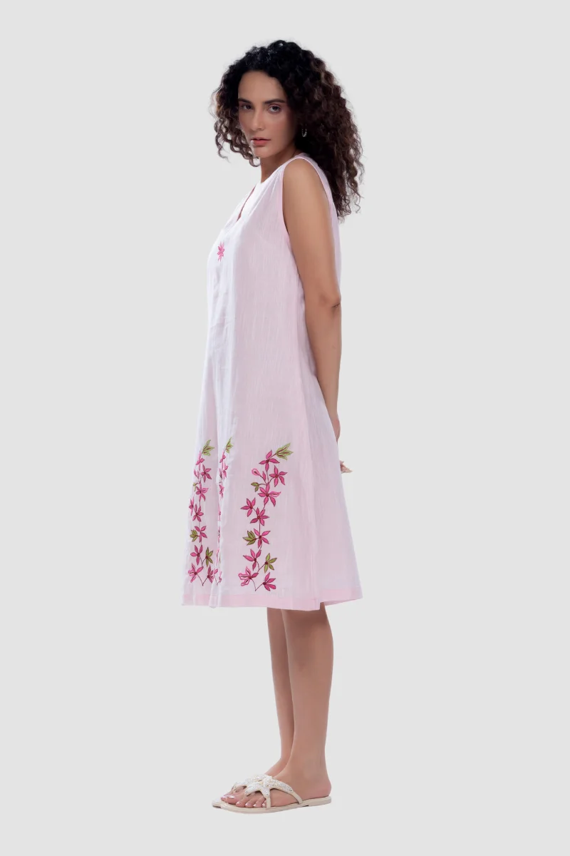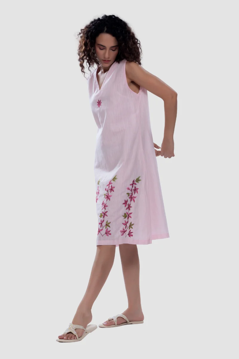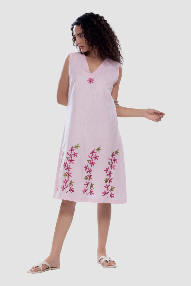 Light, effortless, and quietly striking, this sleeveless cotton kurti is designed in a flattering A-line silhouette that moves beautifully with you. Crafted for warm days, its breathable fabric keeps things easy while the elongated botanical embroidery along the hem adds a graceful, vine-like detail that draws the eye. Understated yet distinctive, it’s the kind of piece you can style simply for daywear or elevate with accessories for a more refined look.