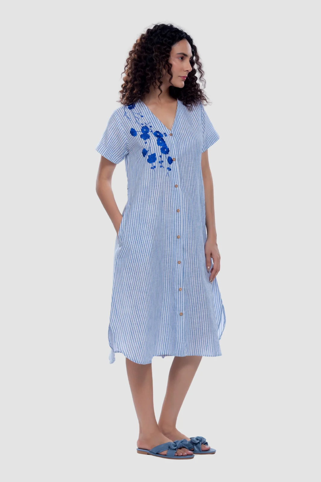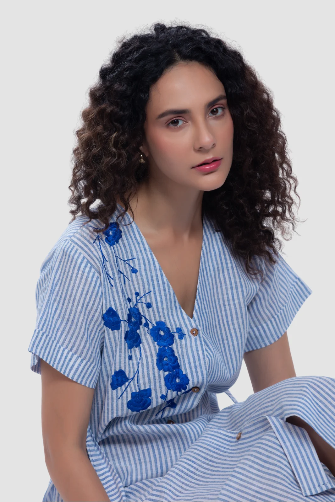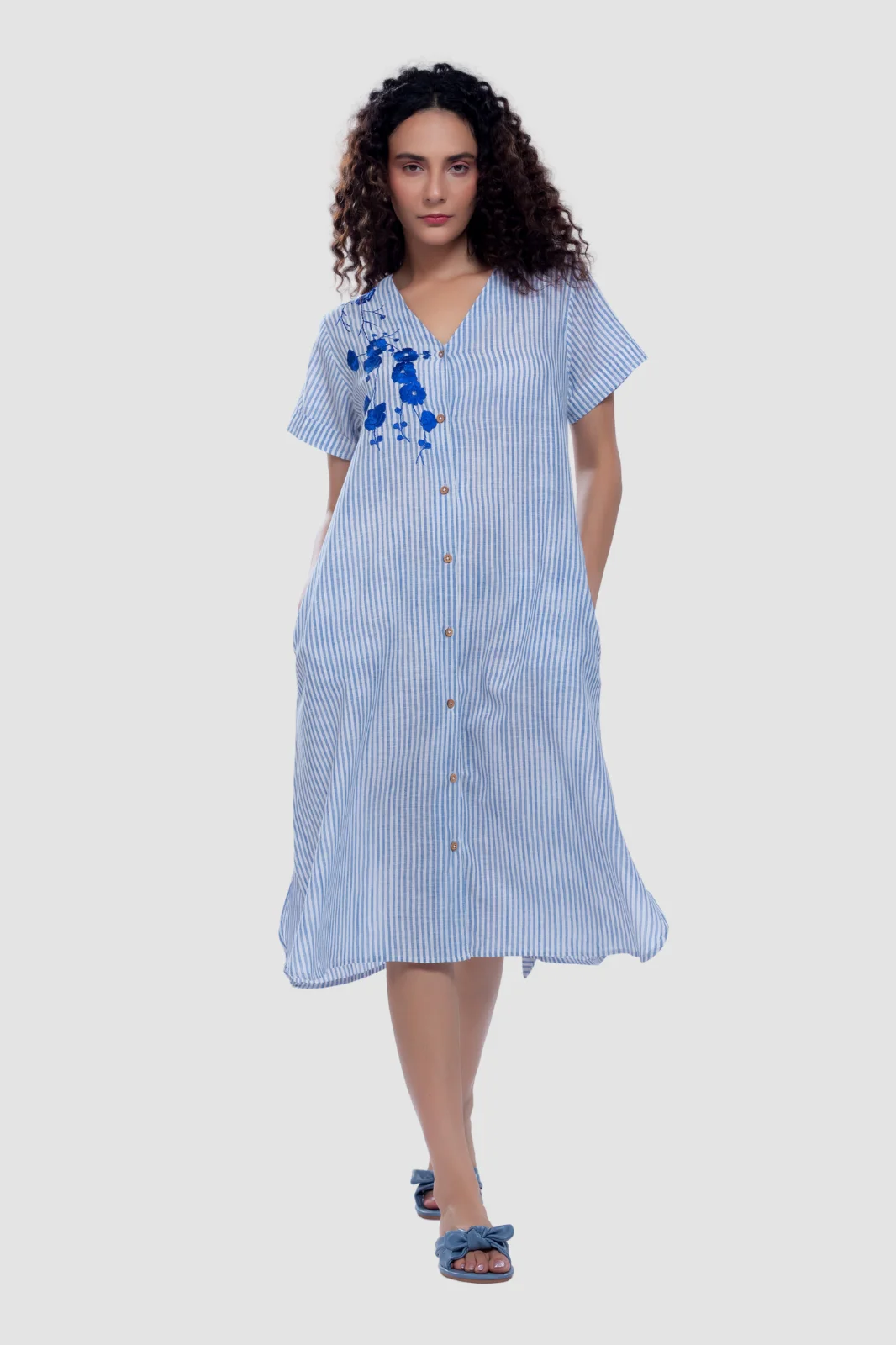 Effortless and composed, MARINE is a front-open cotton linen shirt dress featuring delicate botanical embroidery, a relaxed silhouette, and a detachable belt. Crafted in hand-spun striped cotton linen, it moves with quiet confidence and timeless grace.