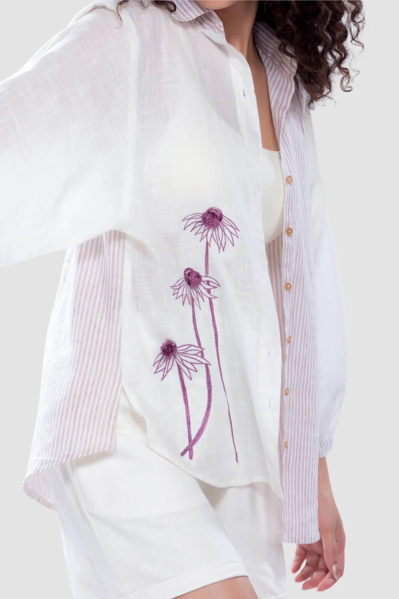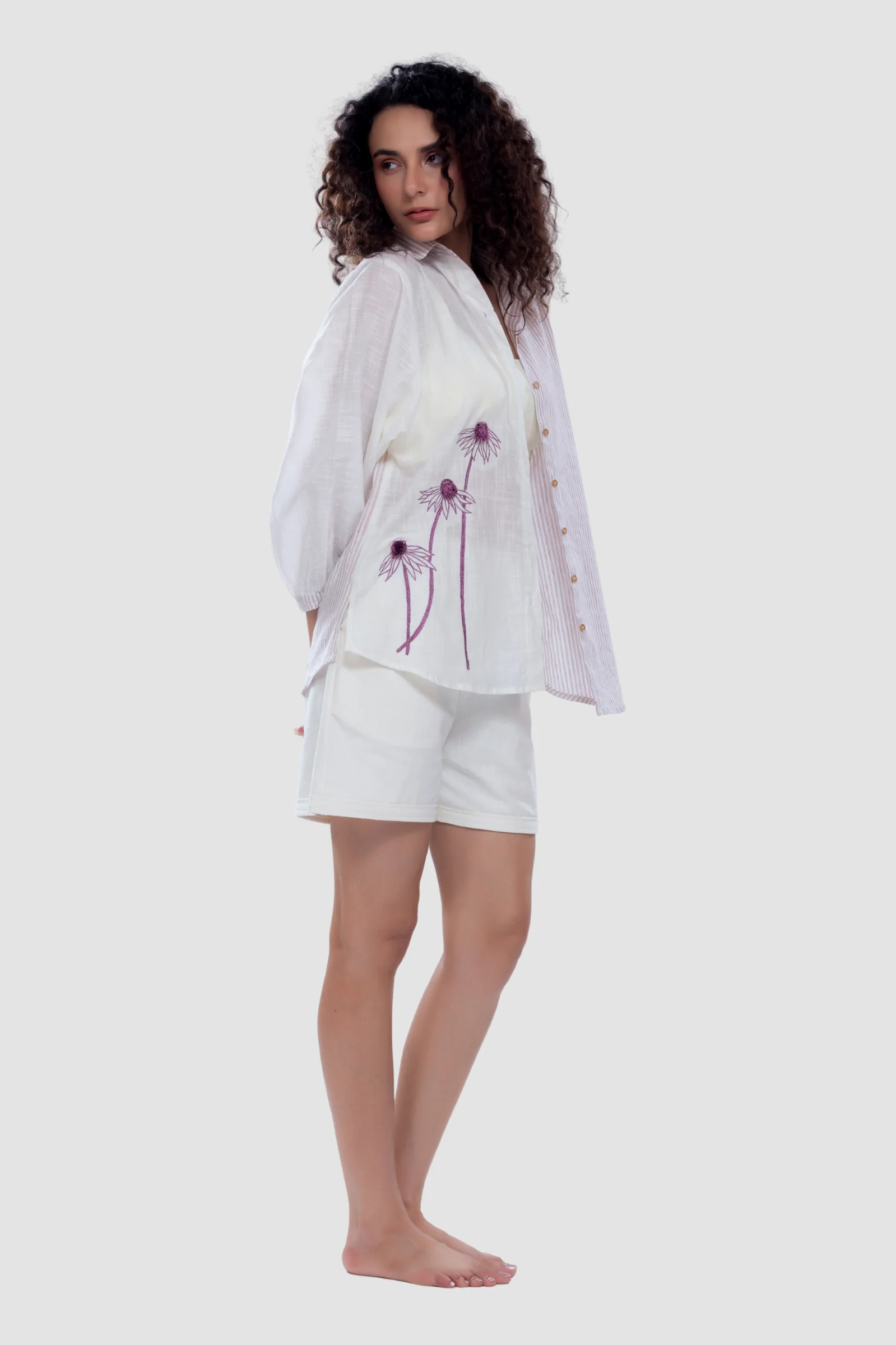 Effortlessly stylish cotton-linen bomber shirt featuring delicate floral embroidery, balloon sleeves, and a relaxed fit — crafted for timeless comfort and easy sophistication.